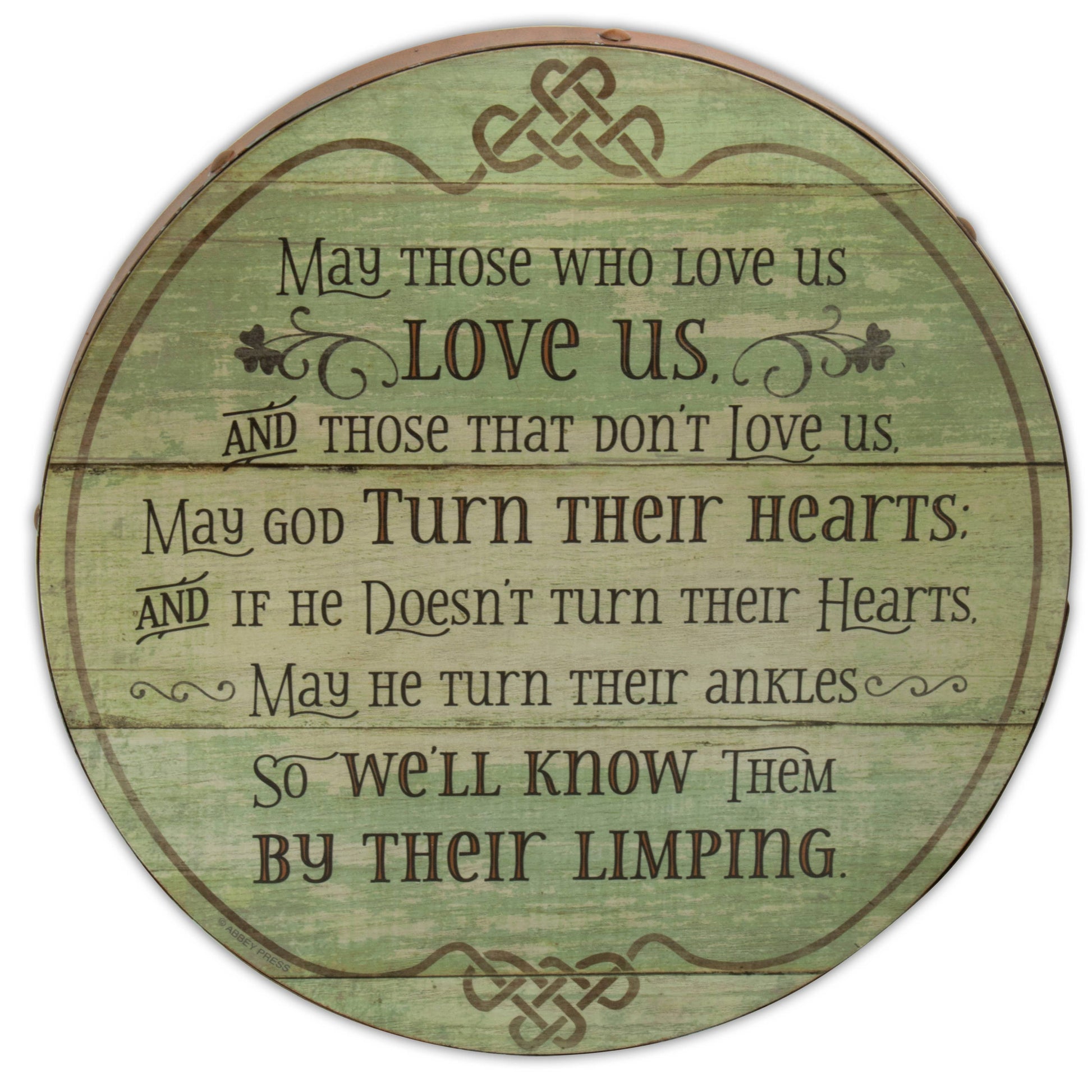 Wooden barrel inspired MDF w/infused irish artwork & text, copper color metal edging to mimic a barrel hoop,w/'the irish limp prayer", ready to hang, bboxed.