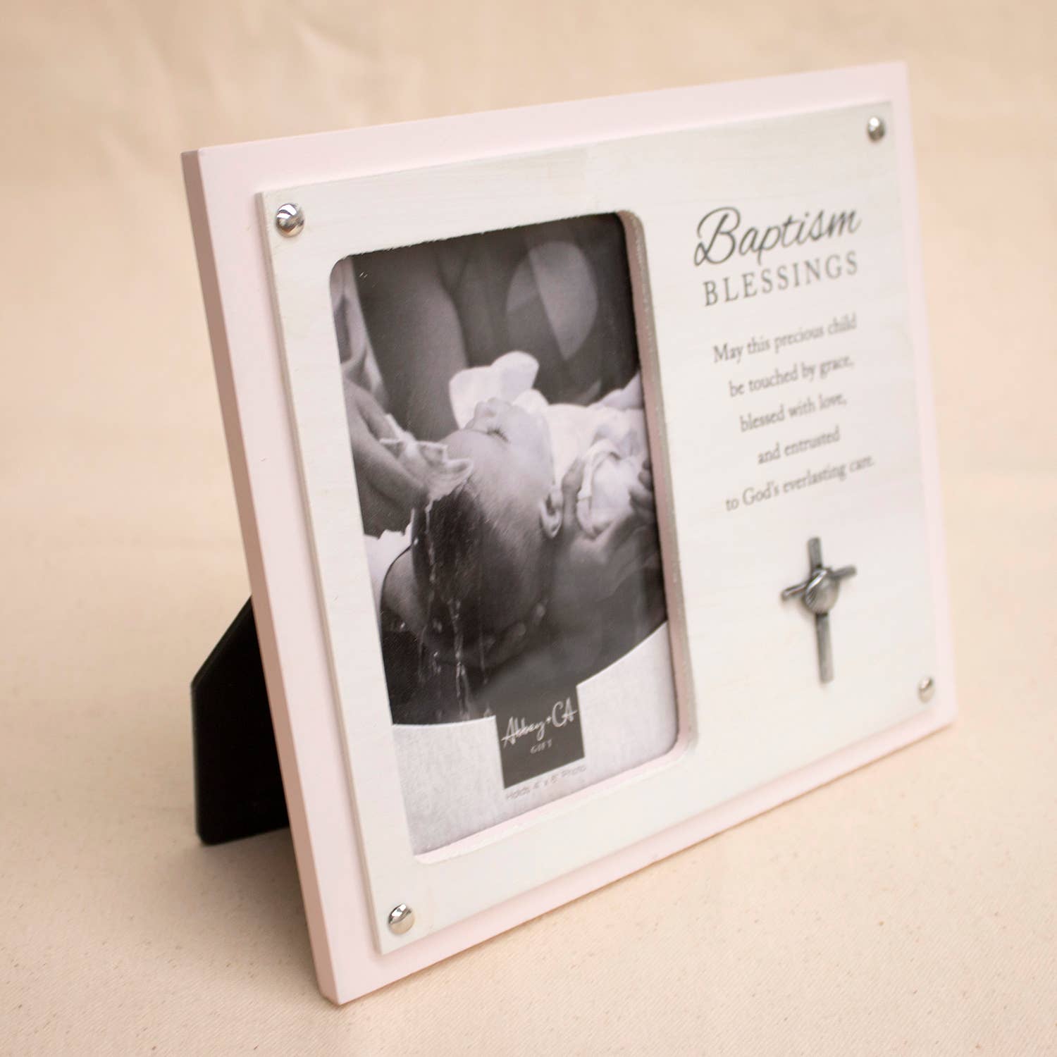 Baptism Blessings pinks and white layered frame crafted in MDF. Features metal cross with scallop shell detail and rivets, all in bright silver finish. Hang or stand. Frame measures 8 ½” W x 7 ½” H and holds 4" x 6" photo. Boxed.