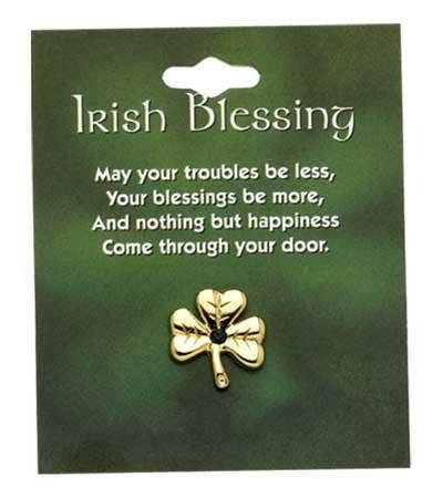 Shamrock lapel pin in gold plated finish w/emerald crystaln on story card.