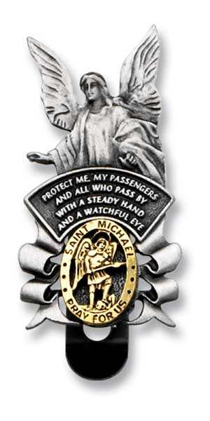 Auto visor clip in bright finish, gold plated st michael w/angel, w/traveler prayer, "protect b492me, my pass….", Carded.