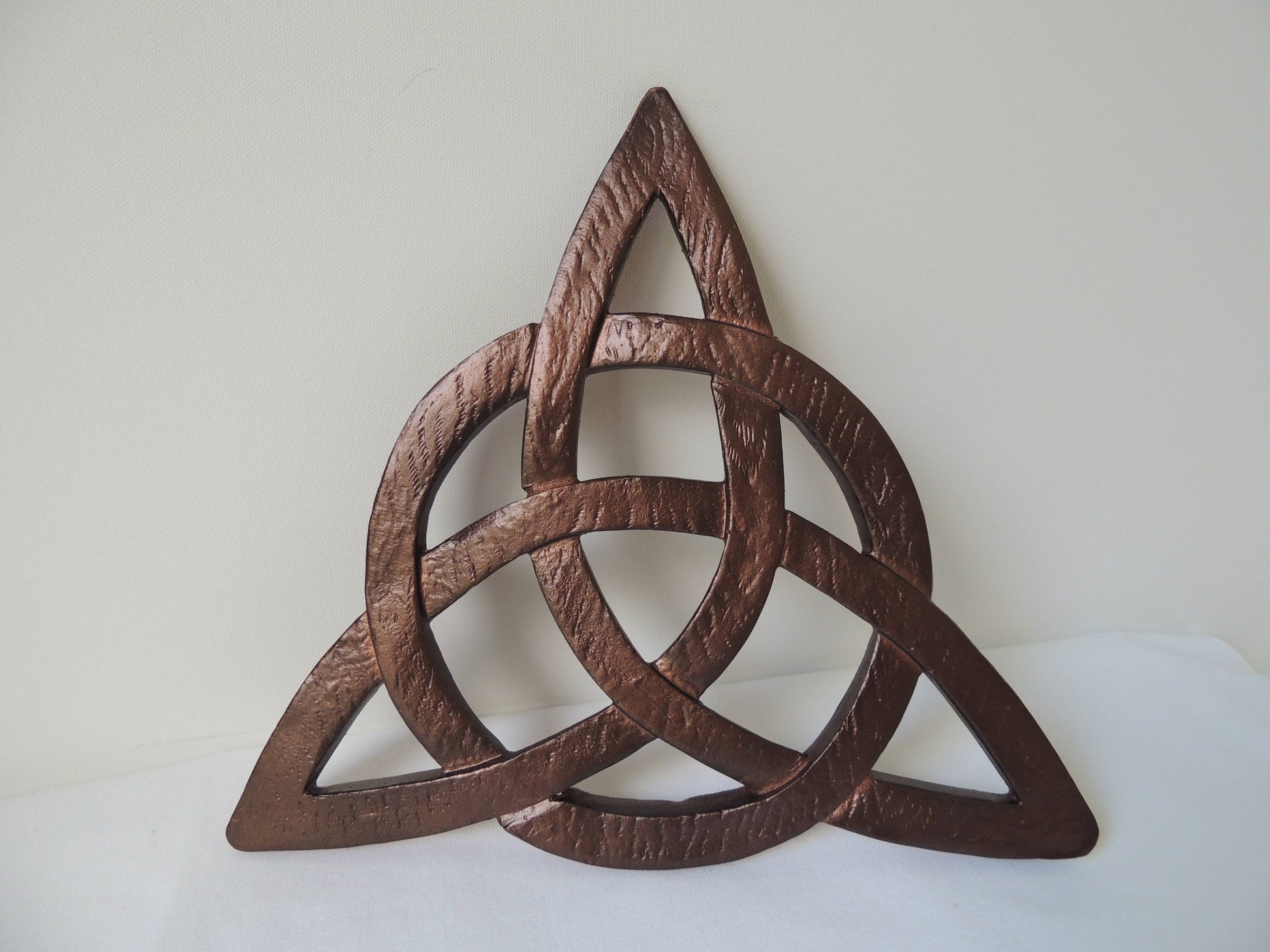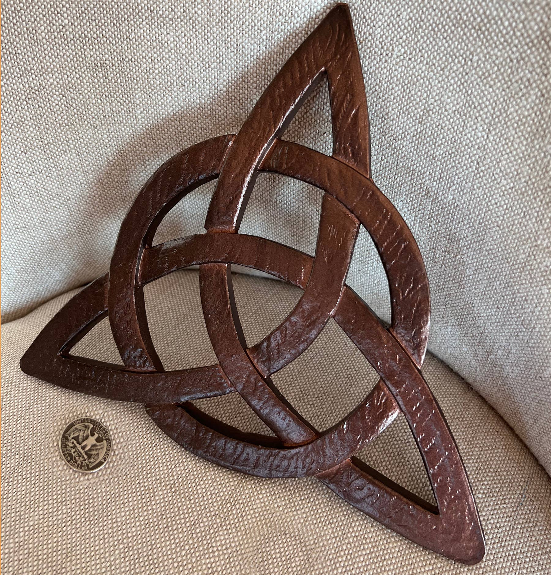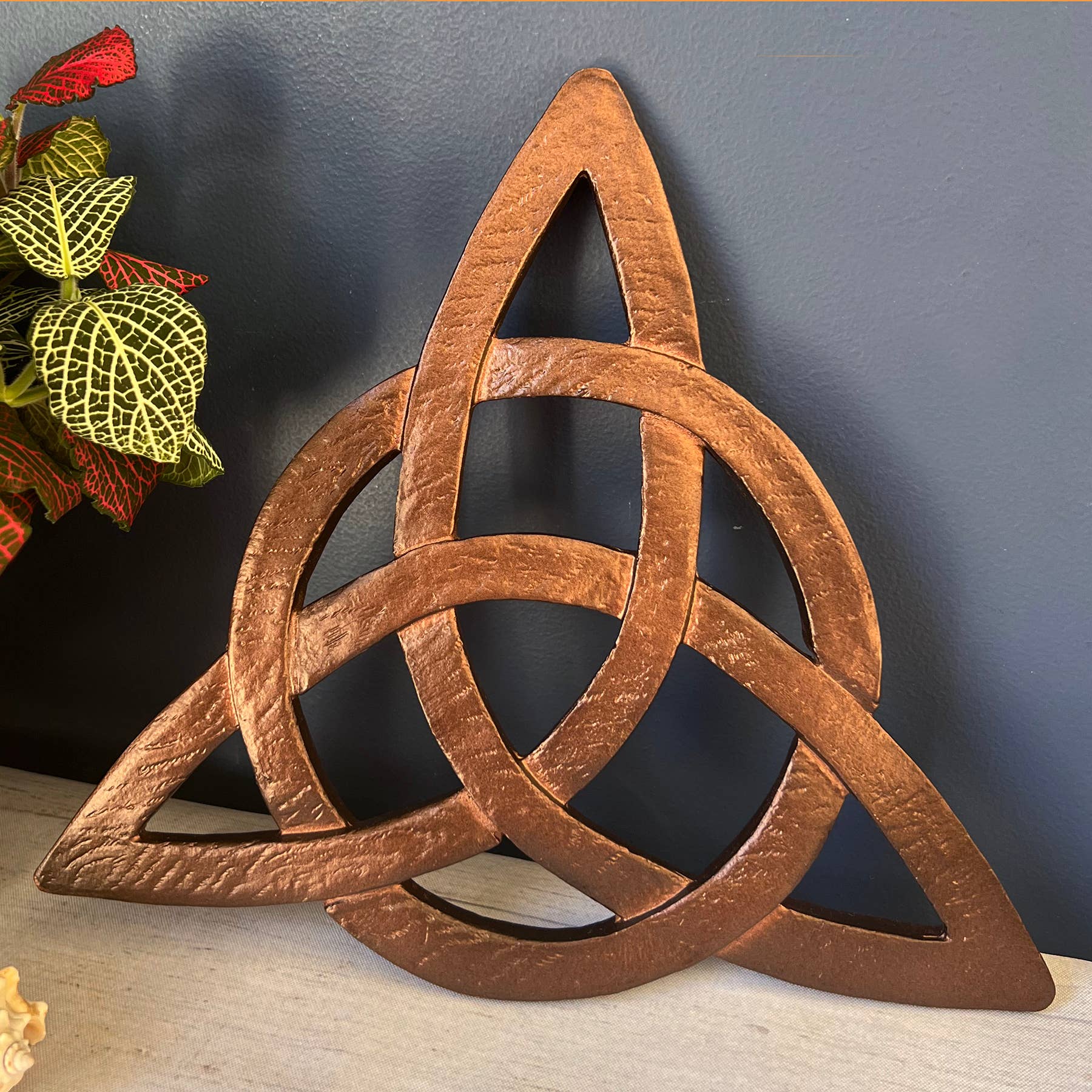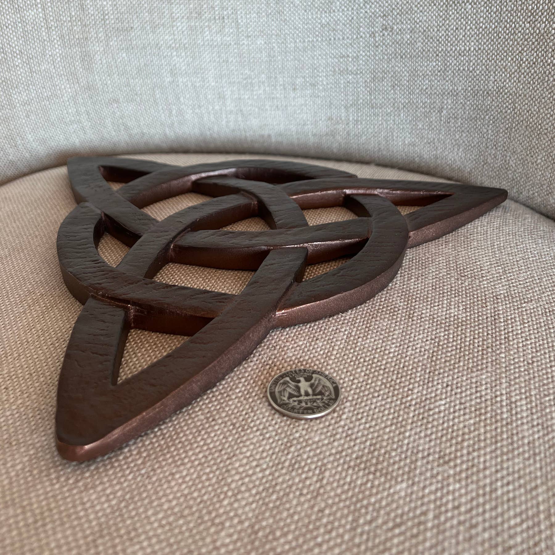 Trinity knot wall hanging crafted in resin w/a wood grain look & mahogany color finish, w/ message card, ready to hang, 12" x 11", boxed.