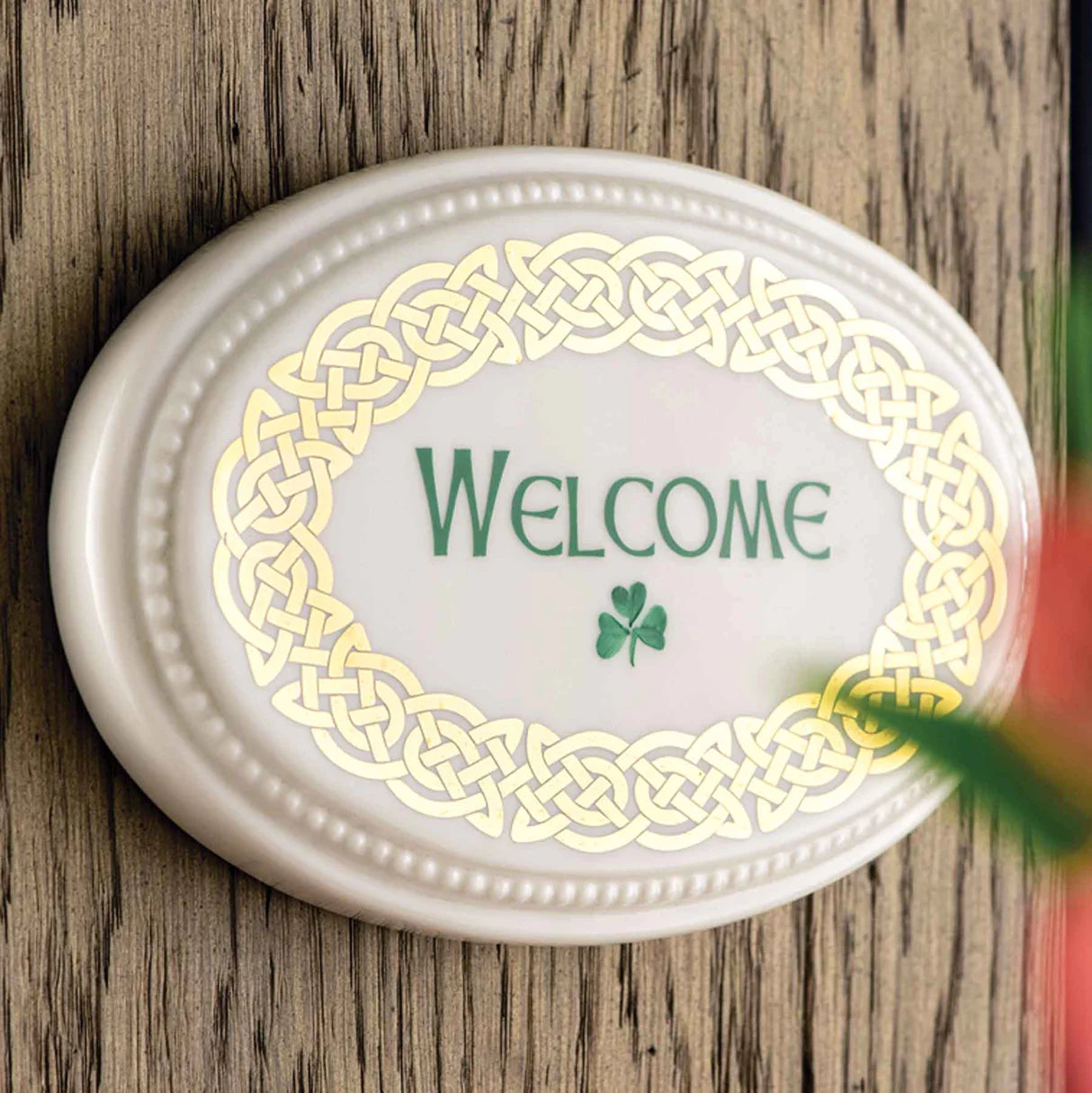 Warmly greet guests or gift a touch of Irish charm with the Belleek Welcome Plaque. This exquisite piece, measuring 6" L x 4" W, is intricately crafted from premium Parian china and proudly made in Ireland. The plaque showcases the inviting word "Welcome", adorned with a vibrant green shamrock, symbolizing good luck and the spirit of the Emerald Isle. Complementing its heartwarming message, the plaque is gracefully bordered by intricate gold Celtic knotwork, a nod to ancient Irish traditions and artistry. Whether it's a wedding, shower, new home celebration, birthday, anniversary, or a simple 'thank you' gesture, this plaque is the perfect emblem of warmth and hospitality. Designed with a hanging provision, it's ready to add a touch of elegance and welcome to any wall.