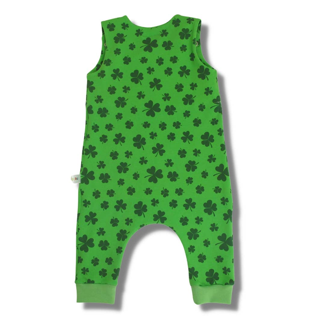 Full length romper with stretchy cuffs an nickel free poppers on shoulder straps for easy fastenings. The charming shamrock motifs adding a touch of Irish luck to your baby's wardrobe. The whimsical shamrocks not only bring a playful and festive vibe but also make it an ideal choice for special occasions, photo sessions, or everyday wear.