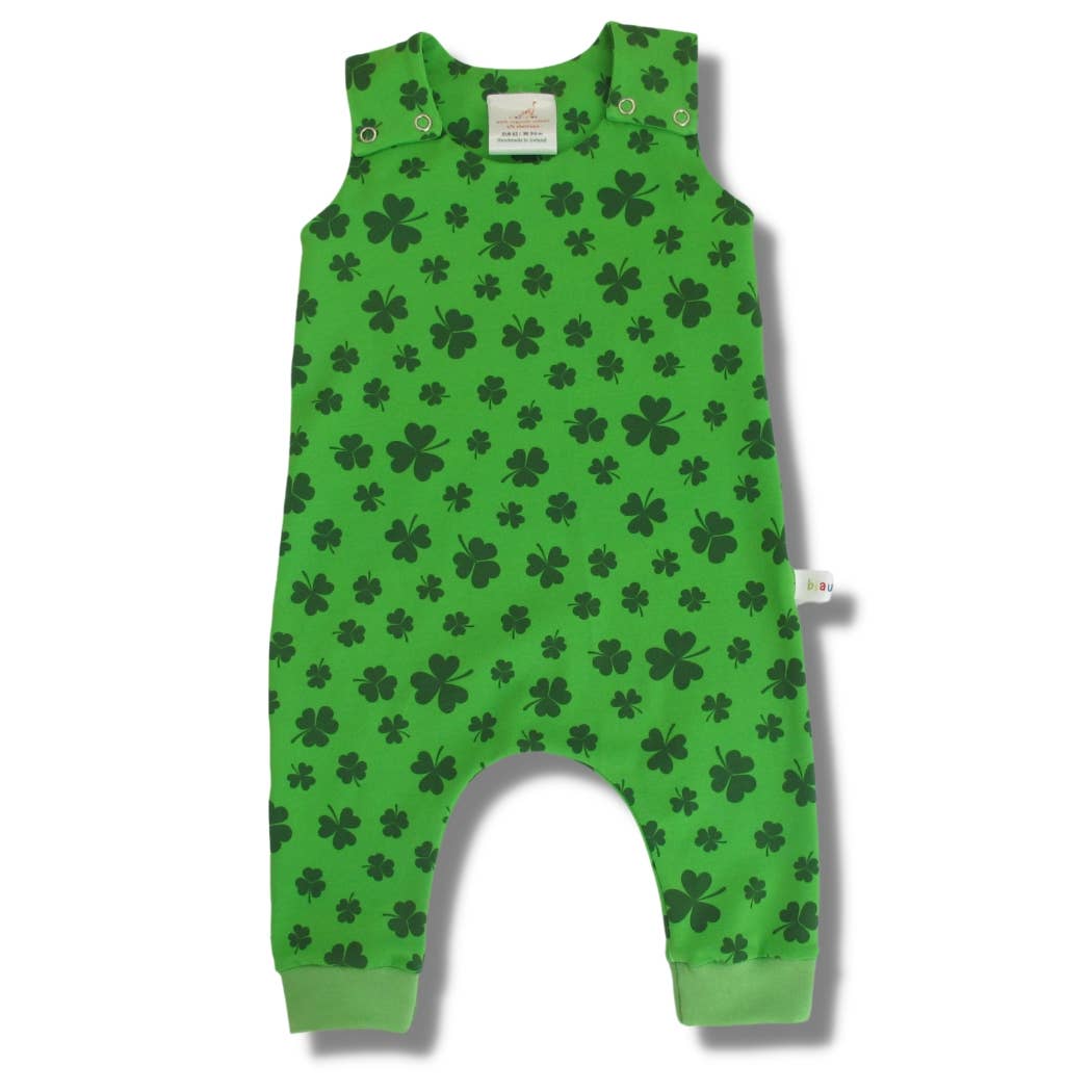 Full length romper with stretchy cuffs an nickel free poppers on shoulder straps for easy fastenings. The charming shamrock motifs adding a touch of Irish luck to your baby's wardrobe. The whimsical shamrocks not only bring a playful and festive vibe but also make it an ideal choice for special occasions, photo sessions, or everyday wear.