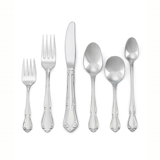 Sleek yet intricate. Designed but understated. Nod to French manors and intricate baroque detail with Chateau. Its fiddleback shape pops with delicately scrolled flowers. These culminate in a pattern popular since its inception, one that promises a timeless staying power for years to come.
