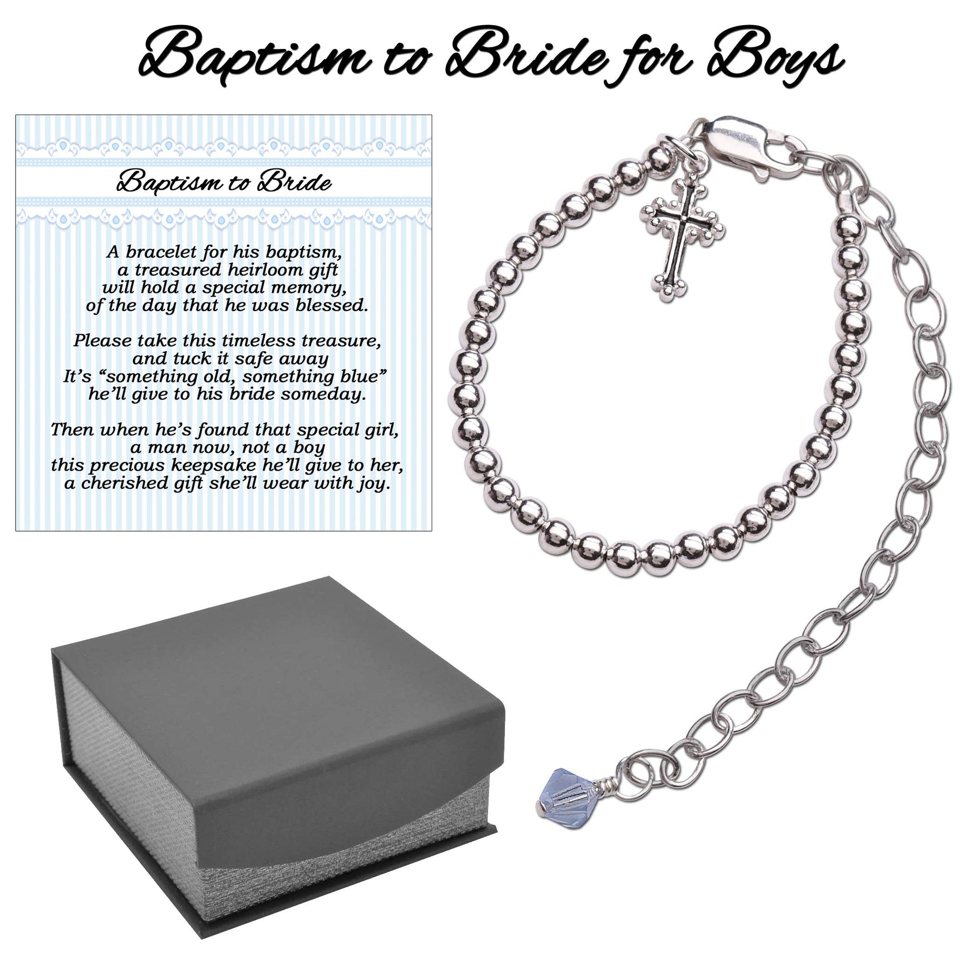 This sweet keepsake is hand-made in the USA from our Timeless Collection. Sterling silver keepsake baptism gift "Baptism to Bride" bracelet gift for boys. This special keepsake will be a treasure that can be worn on his Baptism day and then tucked away and given as a special gift for his bride someday her "something old and something blue". This is designed with .925 sterling silver and beautiful blue high-end Crystal. This comes with a sweet poem and includes a place to write his name and date he was baptized along with a sweet gift box to store the keepsake.