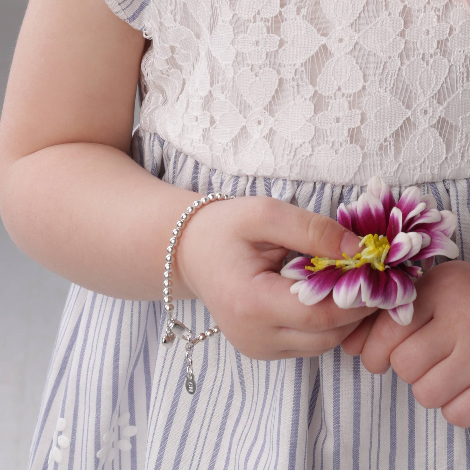 This keepsake bracelet is made with a strand of sterling silver beads accented with a beautiful dainty sterling silver puff heart charm! A gorgeous classic she will cherish forever! Each bracelet has an extension chain, so as the child grows you just move to the next link for a perfect fit. This bracelet is available in three sizes and is great for infants, babies, toddlers, kids on up to tweens. This bracelet comes in a beautiful gift box. Hand made in the USA!