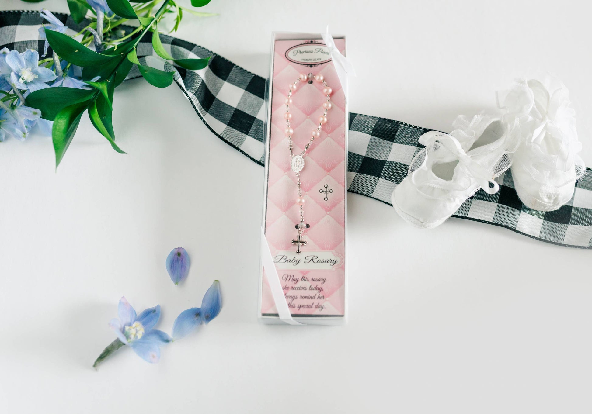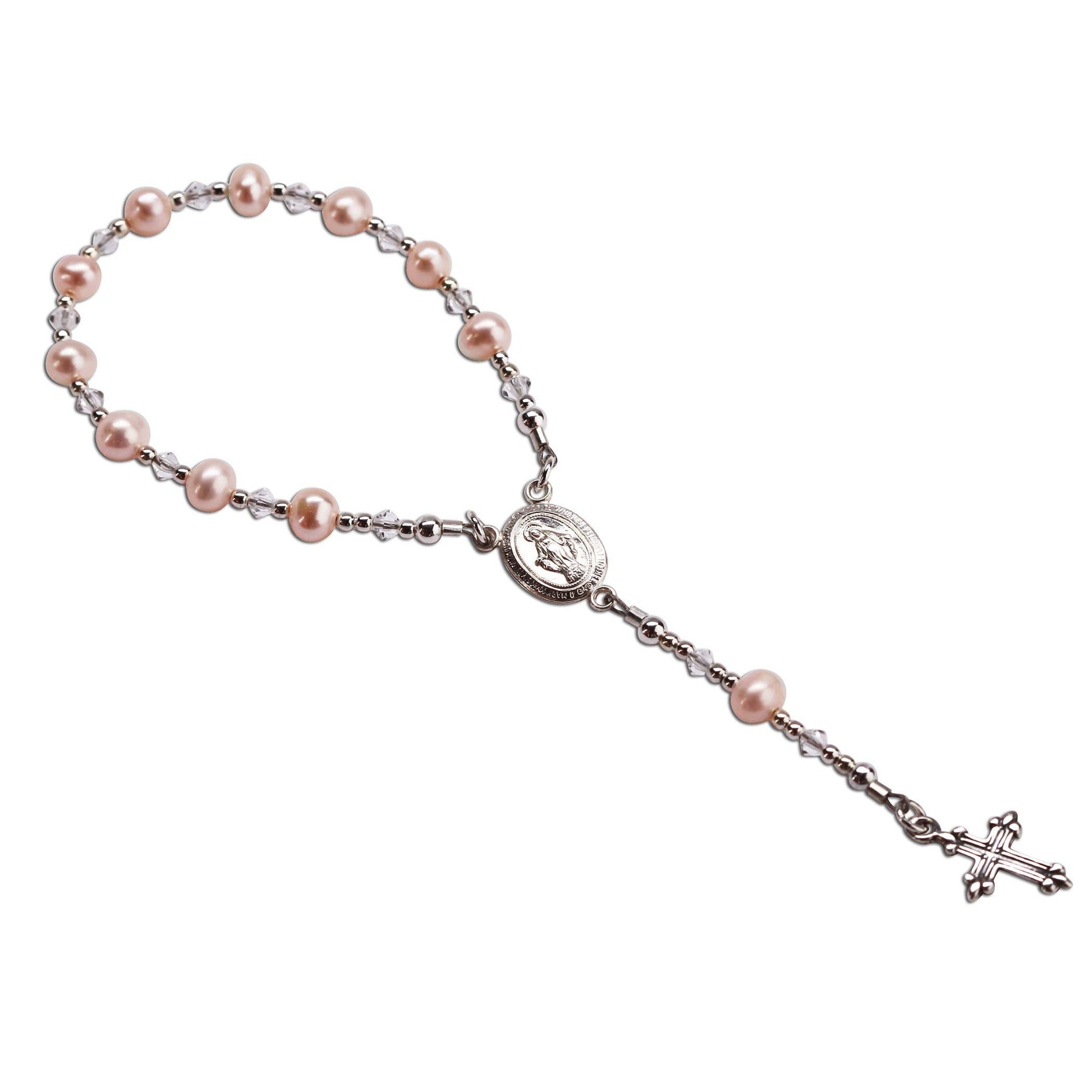 This precious baby rosary makes a special baptism keepsake designed with sterling silver and exquisite soft pink freshwater pearls. This features a miraculous medal and cross charm and is packaged as a special keepsake. Celebrate these cherished moments with this keepsake she will treasure forever!