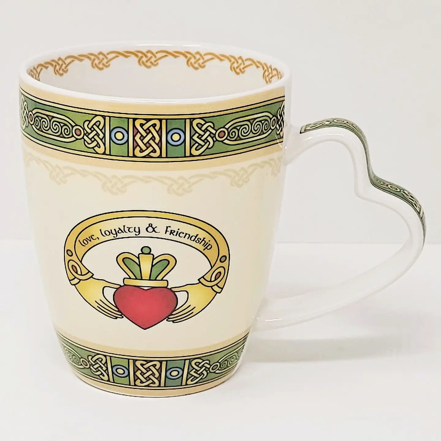 Our Claddagh Celtic Mug is a charming and meaningful piece that beautifully embodies the essence of Irish tradition . Made with care from high-quality new bone china, this mug not only exudes a delicate elegance but also promises lasting durability, ensuring it becomes a beloved keepsake for years to come. At its heart, the Claddagh design graces the surface of this enchanting mug, making it a true symbol of love, loyalty, and friendship. The iconic Claddagh features two hands holding a heart adorned with a crown, representing the eternal bond between two souls, signifying love and loyalty. With a generous capacity of 13 ounces, the mug is the perfect size, ensuring every sip is a gratifying and satisfying experience. Whether you're relishing a quiet moment alone or hosting an intimate gathering with loved ones, this mug's ample size offers the perfect vessel for indulging in the delightful aroma and flavors of your preferred beverage.