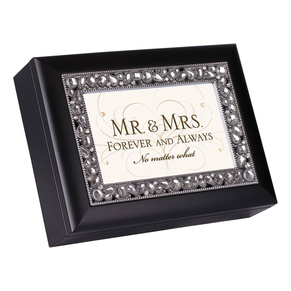 "Mr. & Mrs., forever and always, no matter what." Great as a wedding or anniversary gift, this elegant musical keepsake box is finished in soft black. Lid is set with gem-like stones in a dainty silver tone beaded trim. It's also a photo frame; includes are print with sentiment, under glass. Print can be changed out for a 4" x 6" photo. Removable back under lid makes it easy. Inside of box has black velvet lining; music box compartment is topped with clear glass that shows the Sankyo musical movement. When key is wound, it plays the song "Wonderful World." Decorative legs on bottom are padded to protect furniture. Box is made of a super-sturdy polymer that resists cracking and chipping. Overall size is 8" x 6" x 2 3/4".