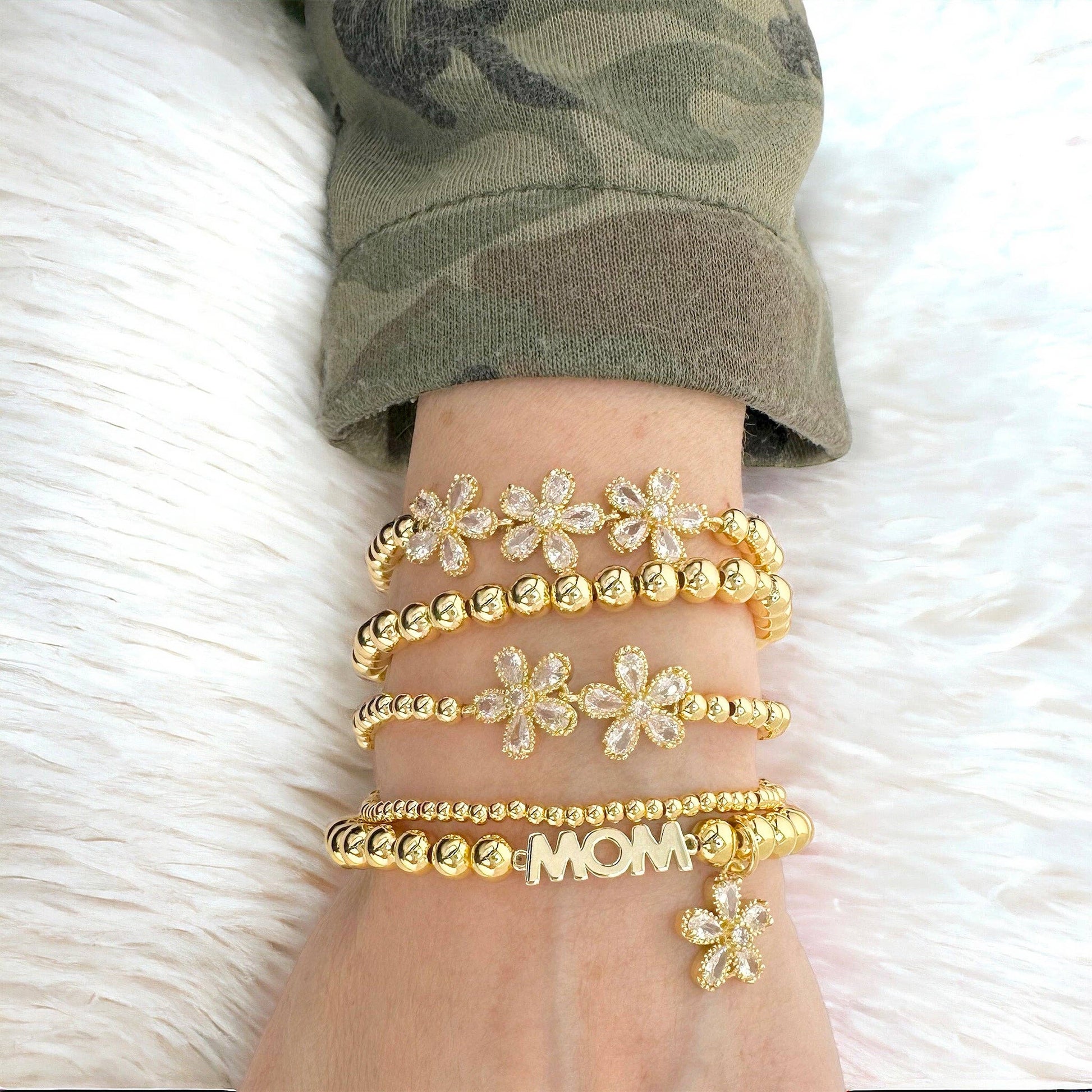 Take a walk through a springtime garden with our Sheila Floral Mom Collection of Bracelets! This blooming beautiful set features 5 bracelets, including a 3-flower design with 6mm beads, a 2-flower design with 5mm beads, a 1-flower "Mom" Bracelet with 6mm beads, and two beaded bracelets in 3mm and 6mm. Perfect for any trendy mom who loves to accessorize! All the bracelets are made with elastic and measure 6.85".