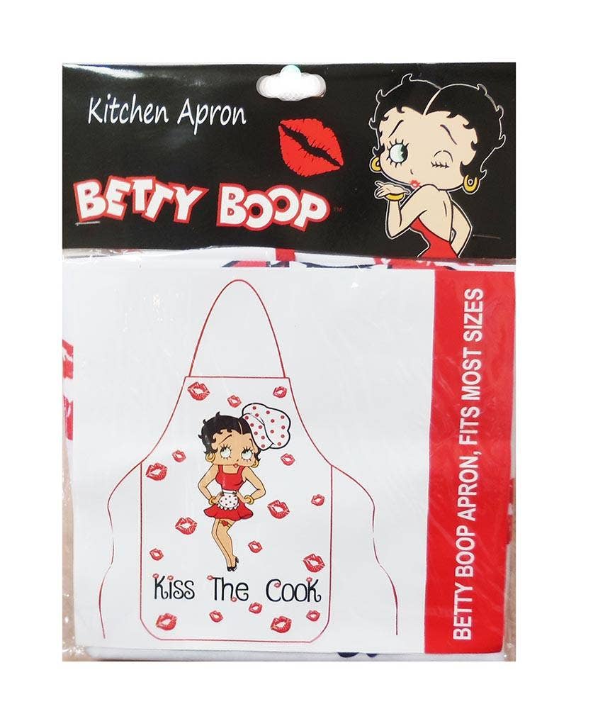 Betty Boop apron with caption "Kiss The Cook". Pictured with Betty in a red dress, apron, baker hat, jewelry, a garter and heels. Red lipstick prints in the background. One size fit most. Packaged with hang tag for easy display. Good gift or stocking stuffer for mom.