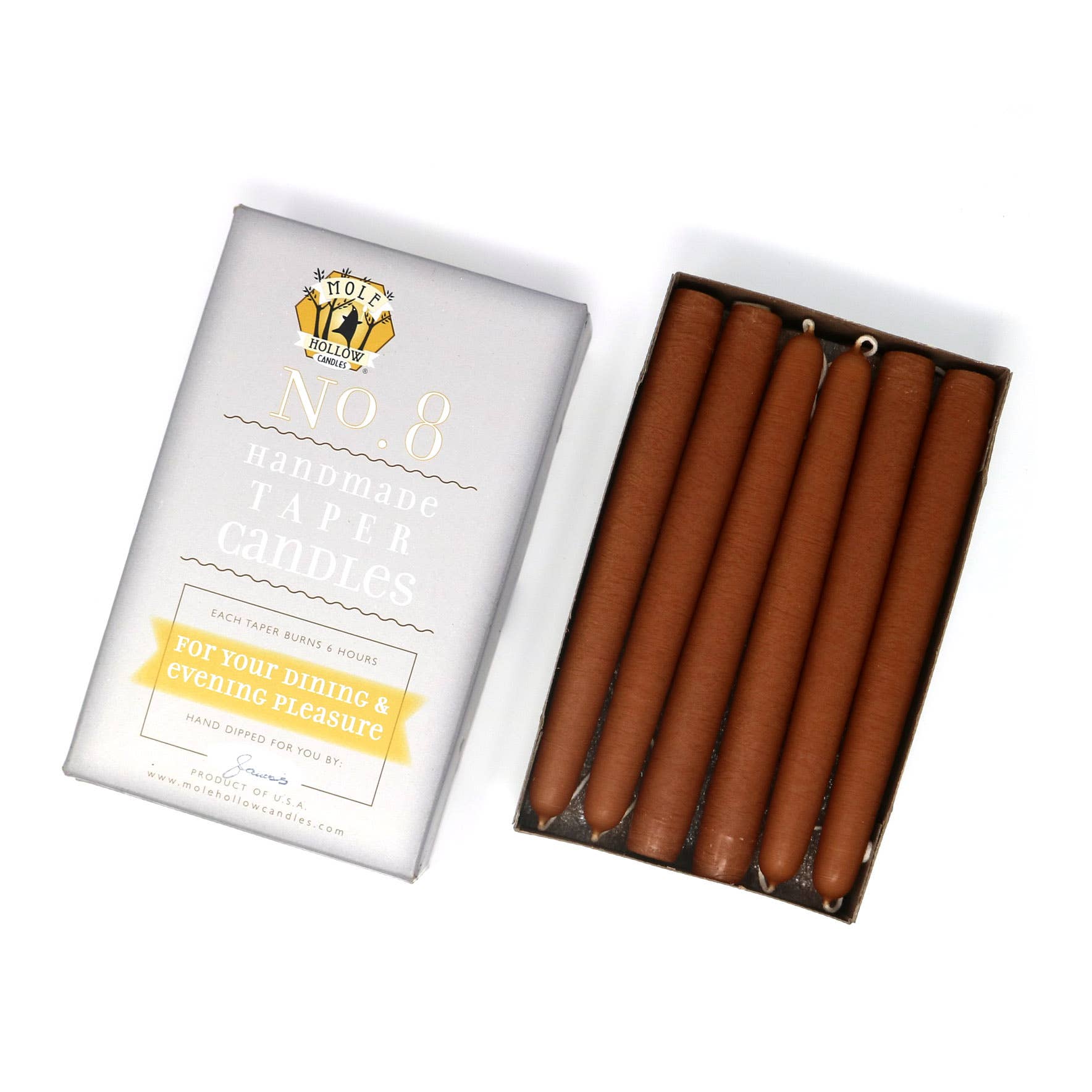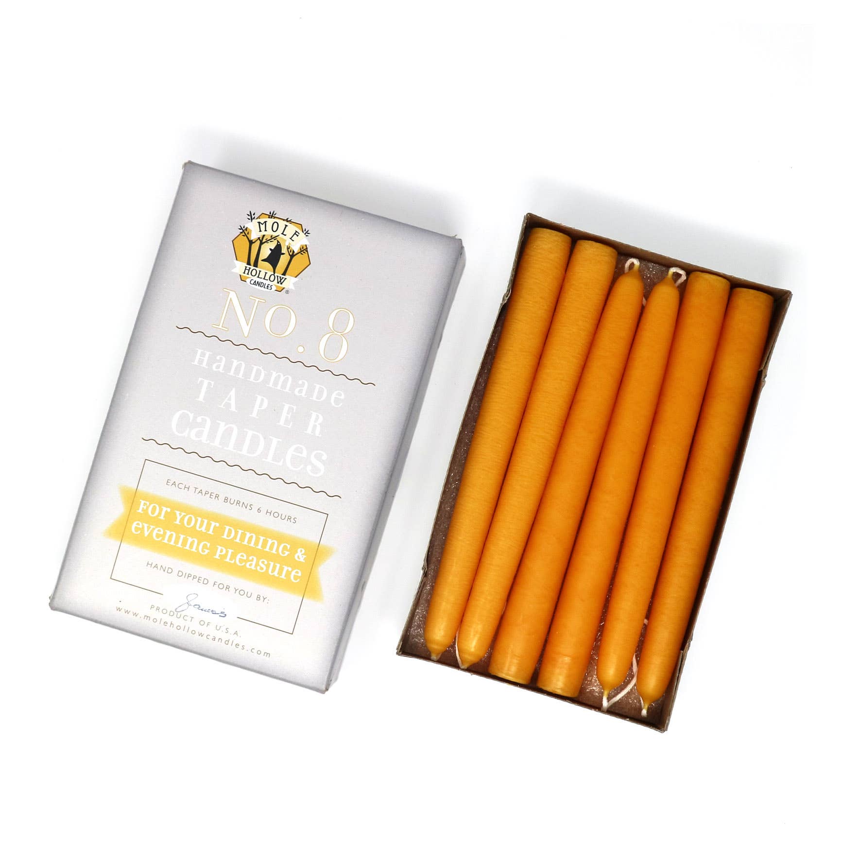 Mole Hollow Candles are hand dipped in Massachusetts using a technique that has been in place since our founding in 1969. Each taper features our signature Spun Finish - a subtle linen-like pattern created by the unique method with which they are dipped.