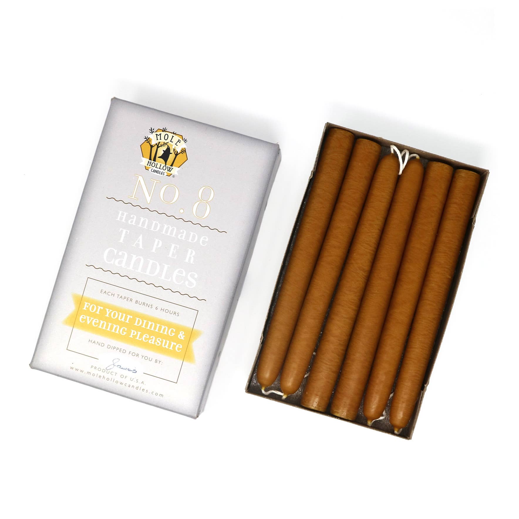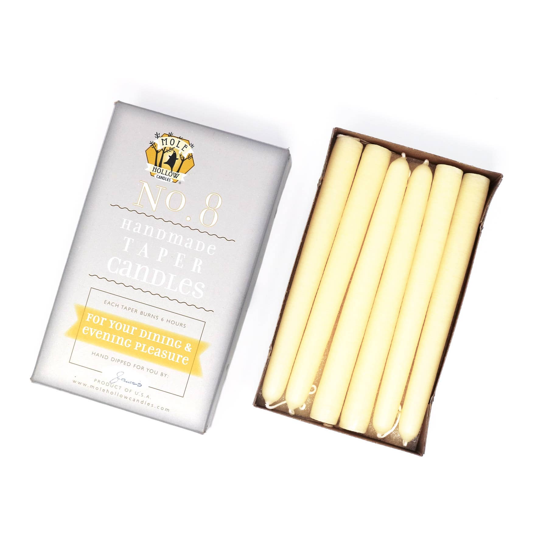Mole Hollow Candles are hand dipped in Massachusetts using a technique that has been in place since our founding in 1969. Each taper features our signature Spun Finish - a subtle linen-like pattern created by the unique method with which they are dipped.