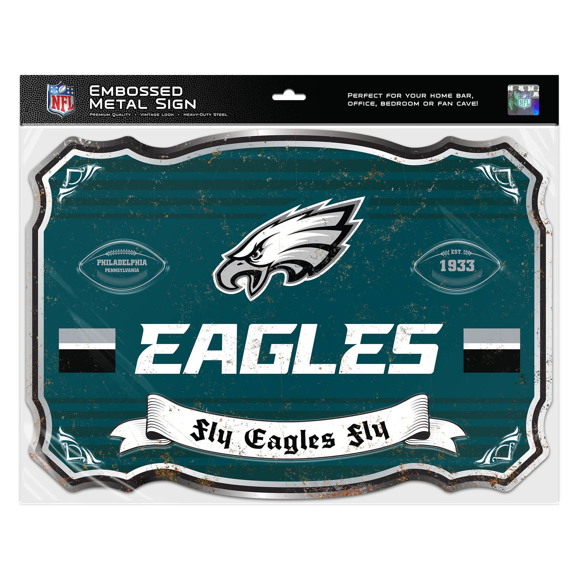 Rep your favorite NFL team in style with this giant 27" x 19" embossed metal sign. Perfect for your fan cave, garage, or game-day setup, it’s made from heavy-duty steel and features a vintage weathered finish for that old-school vibe. The bold team graphics pop, and the two metal hanging hooks on the back make it easy to hang anywhere. Whether you’re watching the game or just showing off your loyalty, this sign’s all about making a statement. A must-have for any die-hard fan looking to add serious flair to their space.
