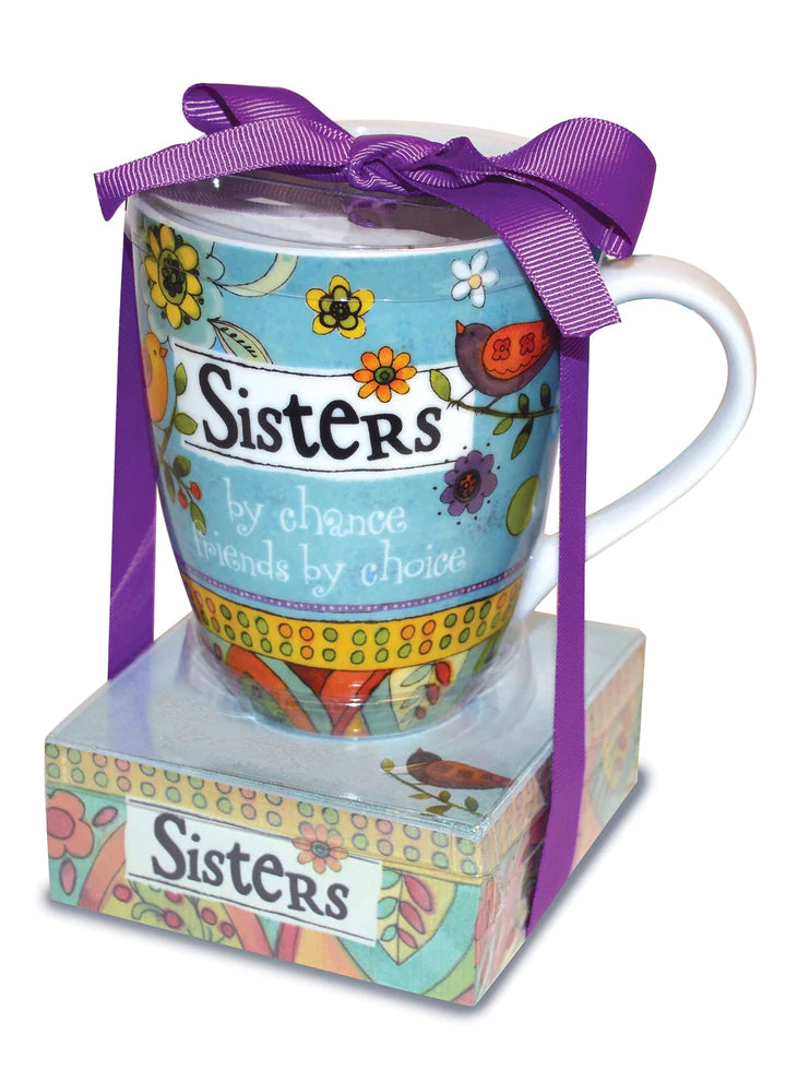 Our mug and note gift set is a cute and functional gift for the extra special people in your life! Gift set includes a 12 oz mug that is dishwasher and microwave safe and a matching 3.75" x 1.5" notepad, packaged together with a decorative ribbon. Features the message: Sisters by chance, friends by choice.