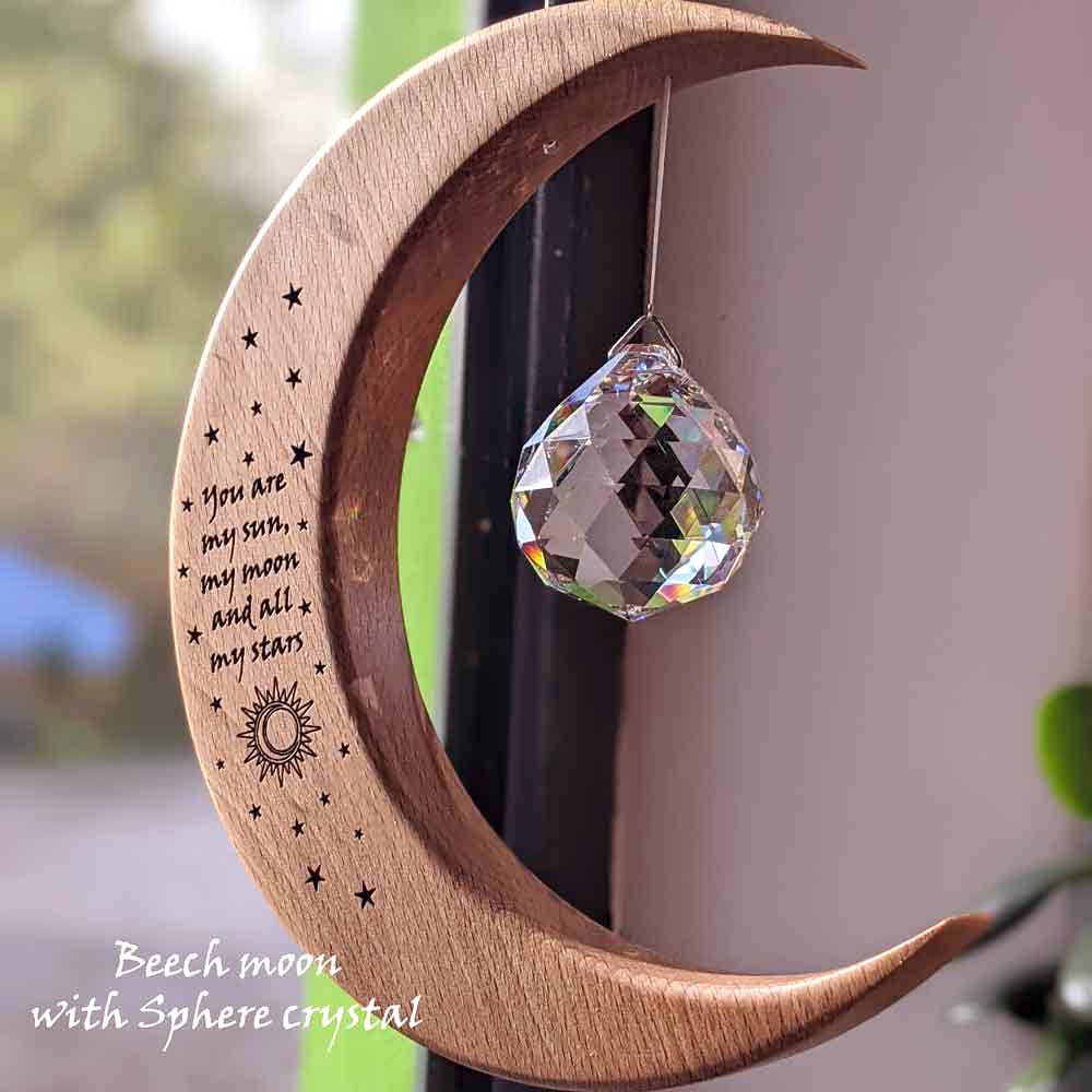 Wooden and crystal suncatcher window decoration. When hung in a window the crystal catches the sunlight and creates dazzling rainbows around the room. This suncatcher, made from Beech wood, has been inscribed with the celestial quote "You are my sun, my moon and all my stars."
