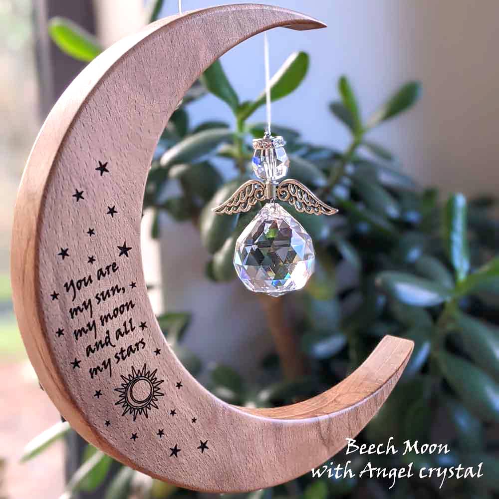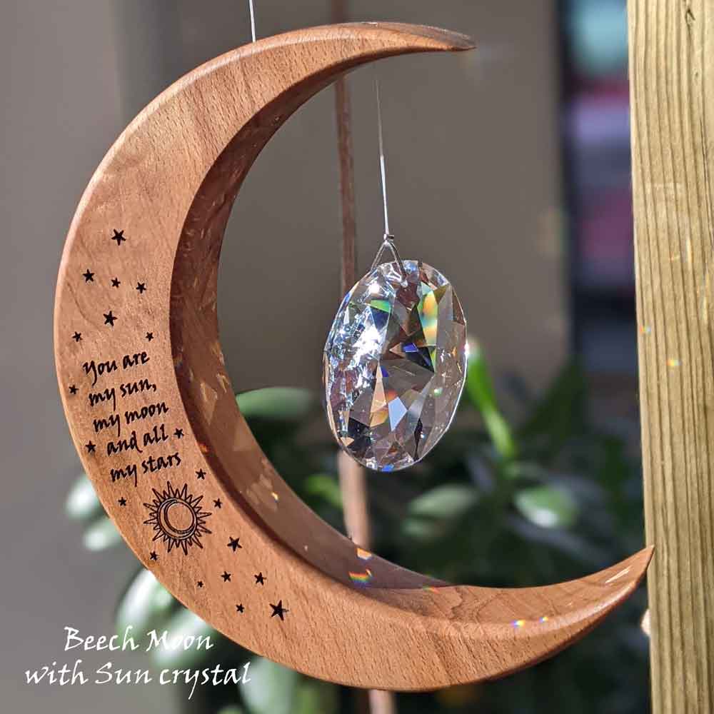 Wooden and crystal suncatcher window decoration. When hung in a window the crystal catches the sunlight and creates dazzling rainbows around the room. This suncatcher, made from Beech wood, has been inscribed with the celestial quote "You are my sun, my moon and all my stars."