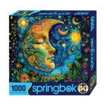 This vibrant artwork from artist Claudia McKinney features a personified crescent moon adorned with intricate patterns, surrounded by stars and celestial elements that play with your imagination. Set against a rich blue background with floral elements, this 1000 piece puzzle evokes wonder and serenity.