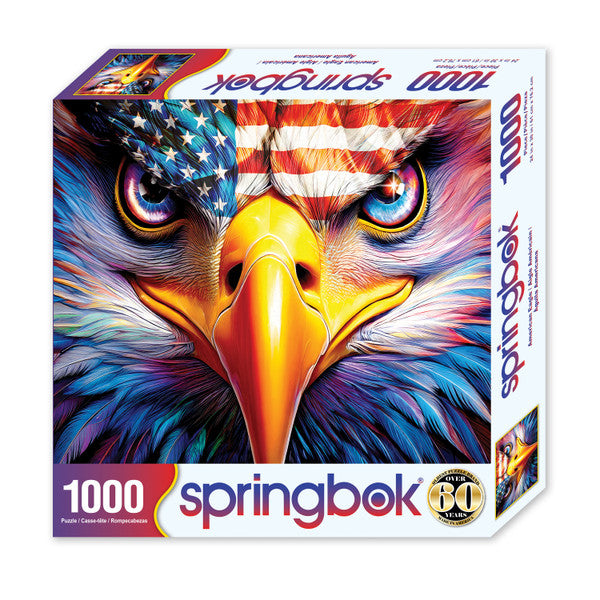 Celebrate freedom and strength with Springbok's 1000-piece jigsaw puzzle, featuring a bold and electrifying eagle portrait designed by artist Alondra Salgado at Springbok Studios, adorned with the stars and stripes of the American flag. With piercing eyes and intricate feather details in vibrant, artistic colors, this puzzle embodies the power and pride of the USA. A striking and challenging design, perfect for patriots and puzzle enthusiasts alike. Show your patriotic pride with Springbok’s premium puzzle experience!