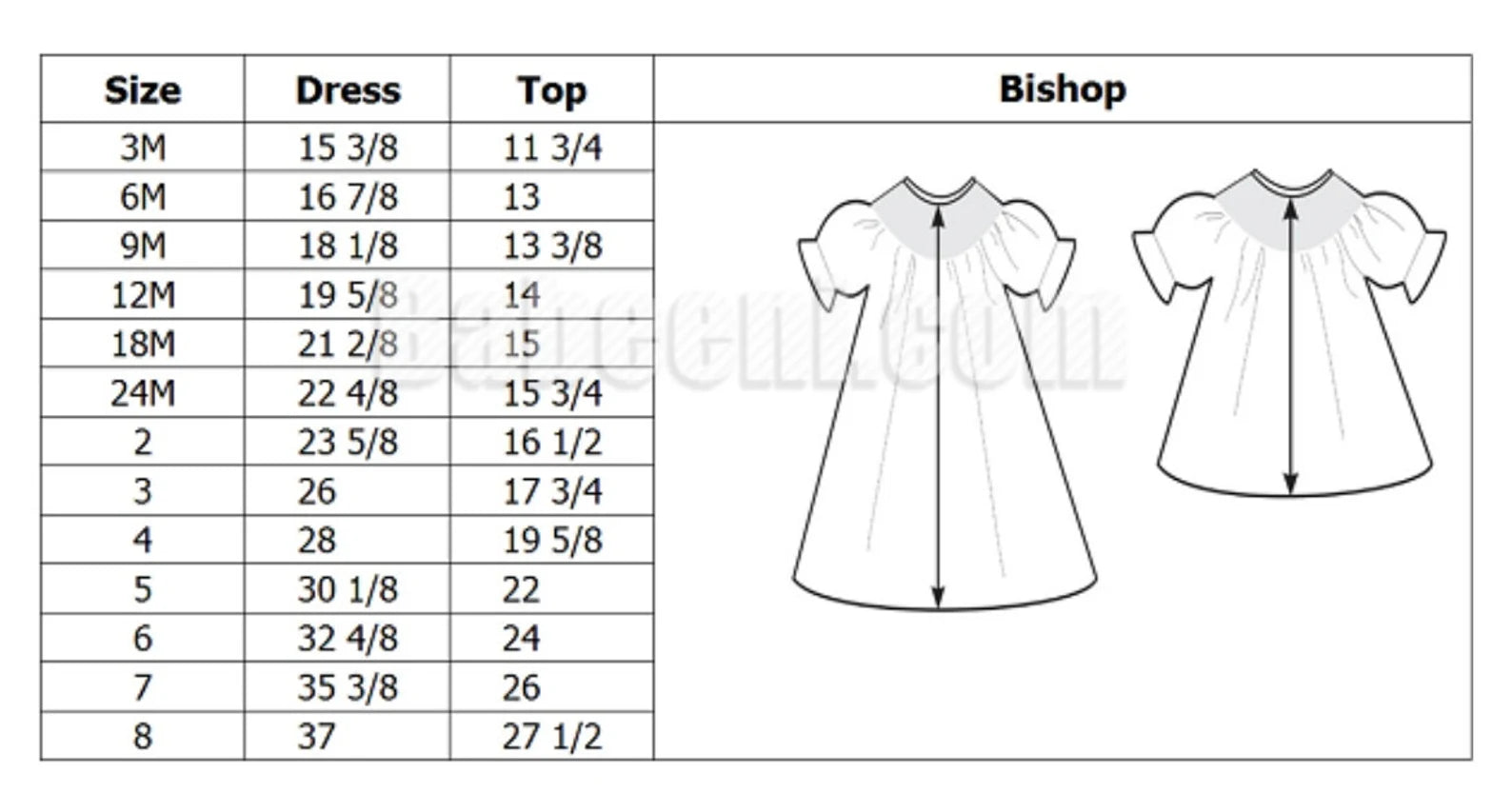 Note: Bishop dresses are designed to be mid-calf to ankle length and are made to last two years. If you don't want it to fit to the ankles, consider ordering a size down from current size.