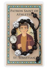 ADJUSTABLE CORDED BLACK WOOD ST. SEBASTIAN BRACELET. COMES WITH LANINATED ST. SEBASTIAN PRAYER CARD AND HANG BAG.