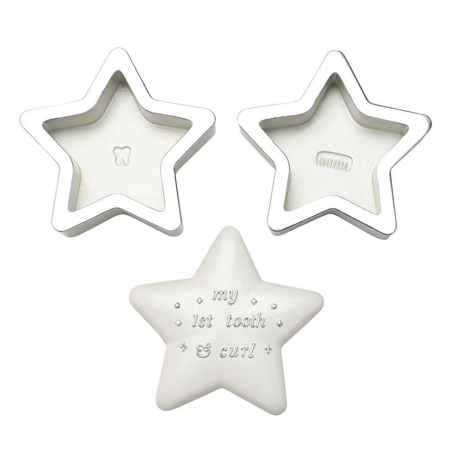 Bambino BY JULIANA® White and Silver Star Shaped Tooth & Curl Keepsake Box Set. A charming and elegant addition to any child’s nursery.