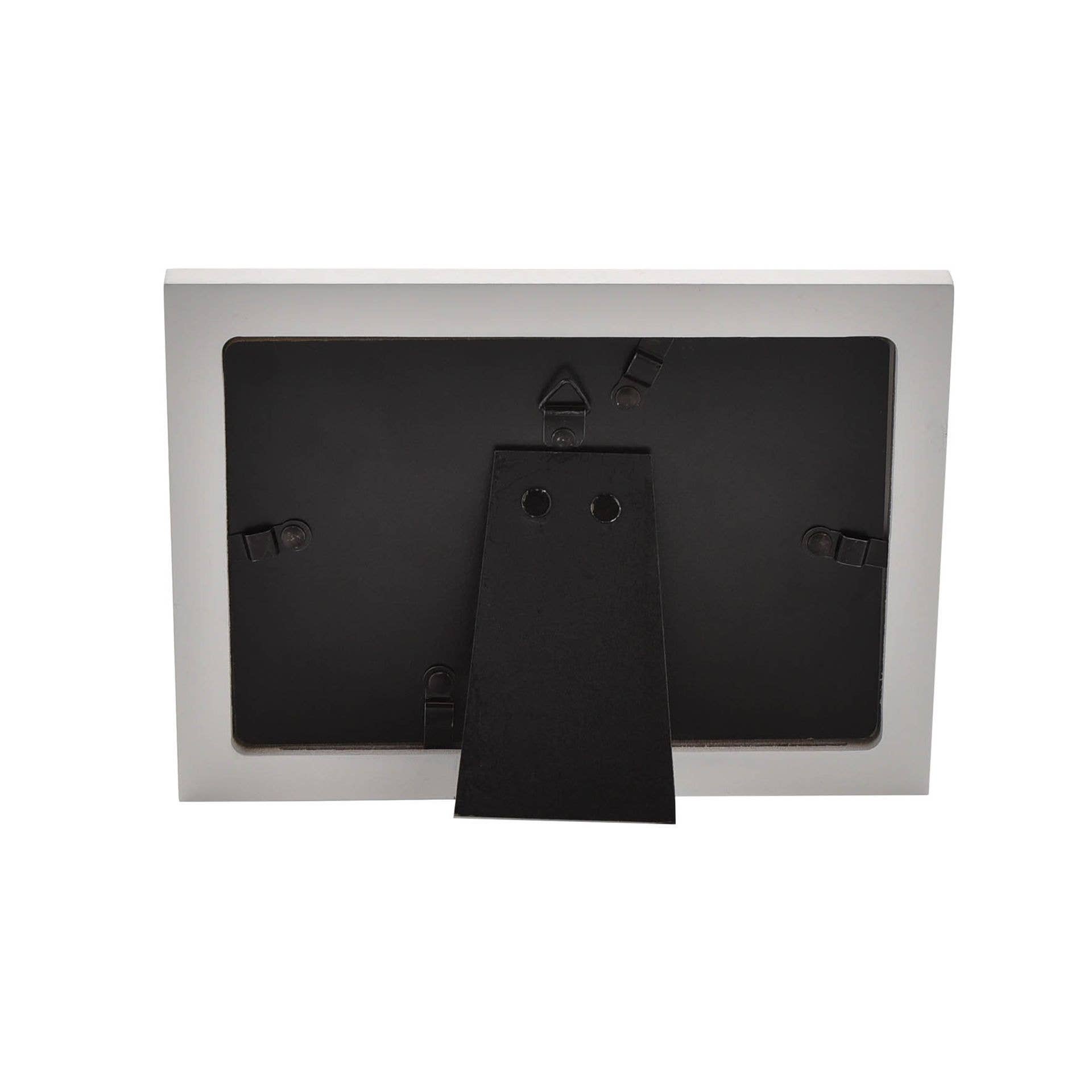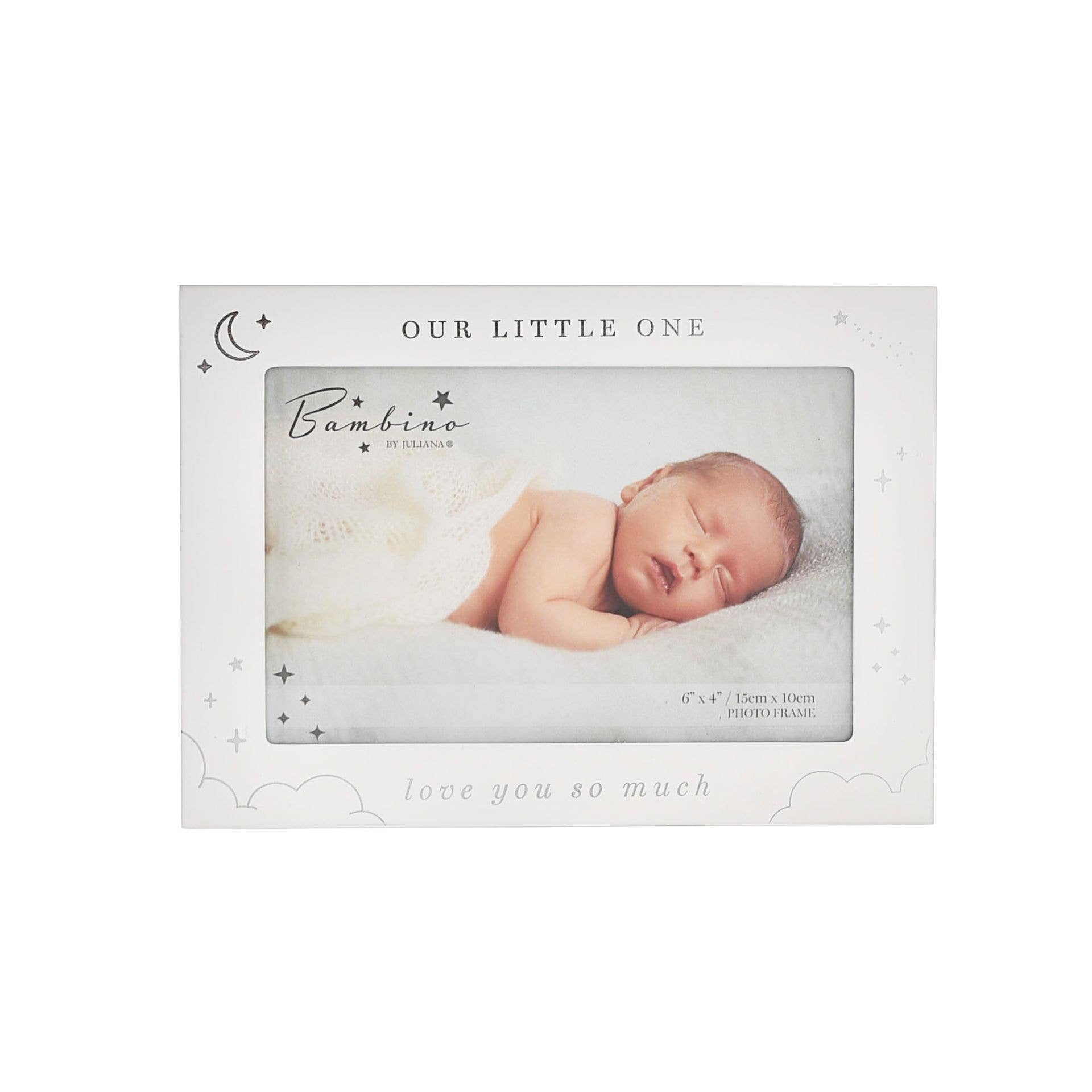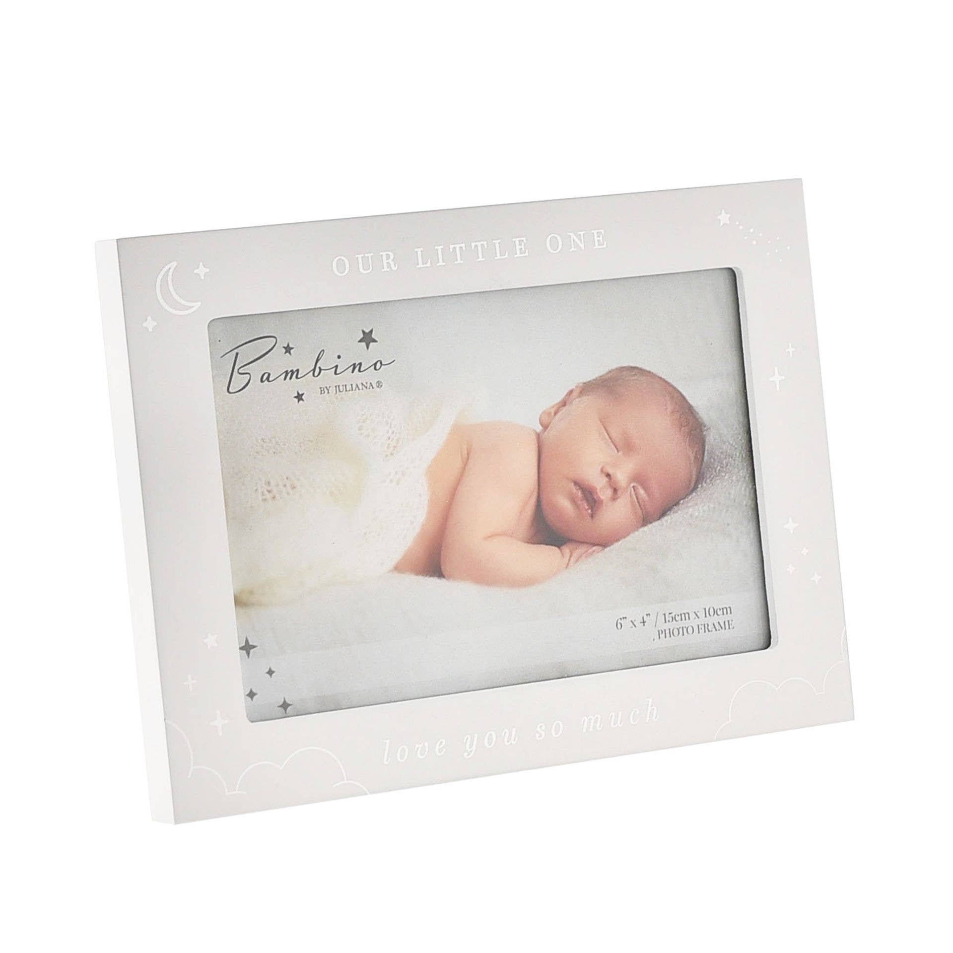 It features a matt white wooden finish and rectangular aperture, enhanced by silver detailing, including ‘Our Little One’ sentiment. The rear attachments offer the option of either standing the frame upright or hanging it on the wall.