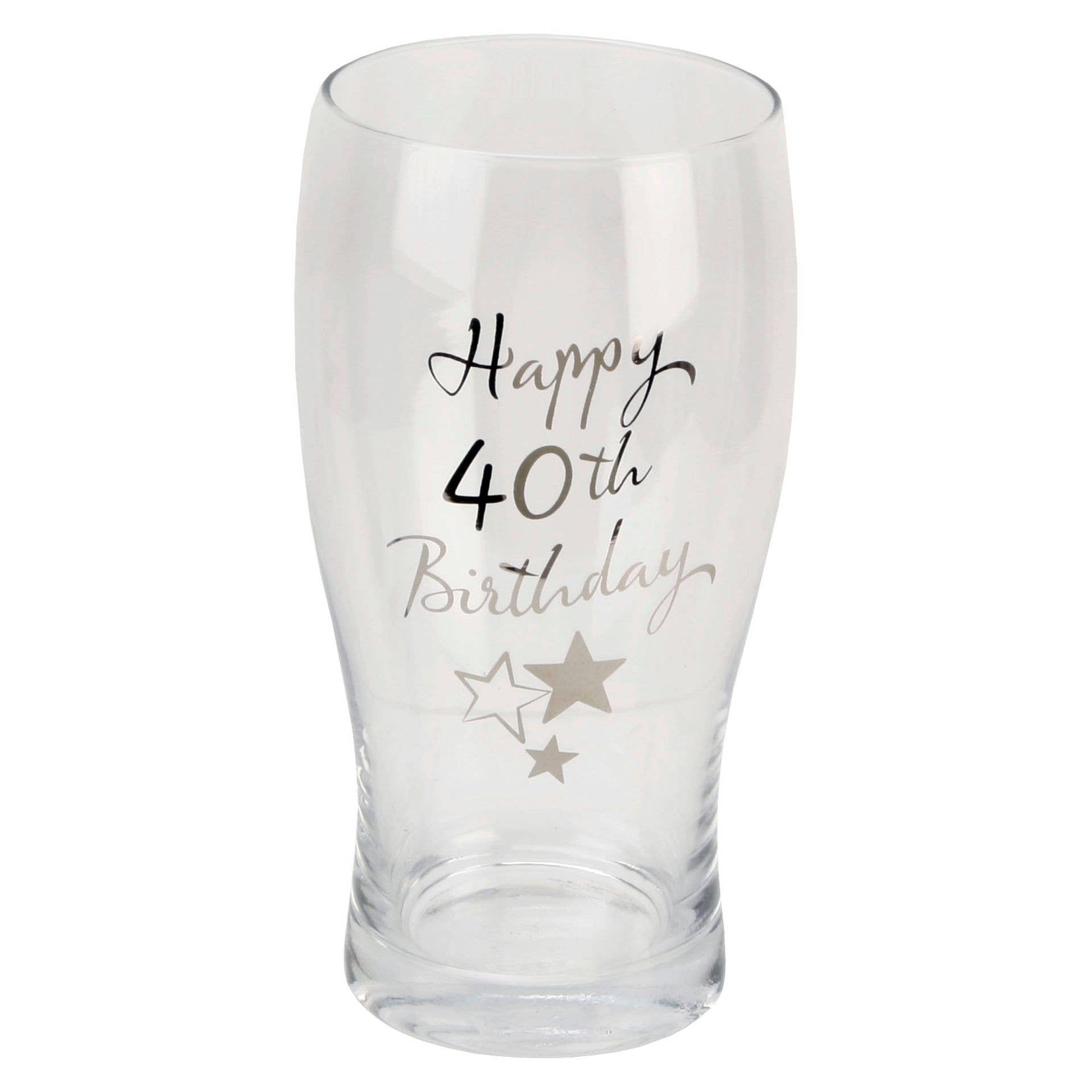 The pint glass is adorned with a 'Happy 40th Birthday' message with silver stars accompanying the birthday message. This gift makes for a great birthday present for someone turning 40 and is presented in good quality, satin lined display packaging.