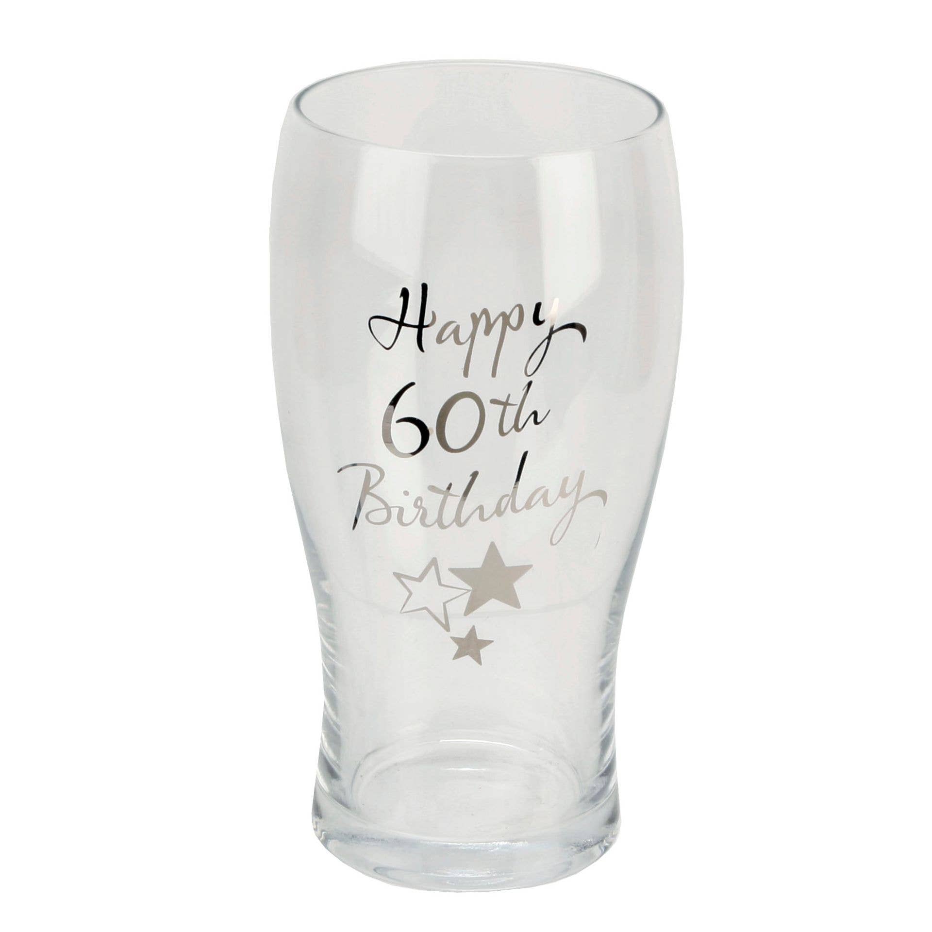 The pint glass is adorned with a 'Happy 60th Birthday' message with silver stars accompanying the birthday message. This gift makes for a great birthday present for someone turning 60 and is presented in good quality, satin lined display packaging.